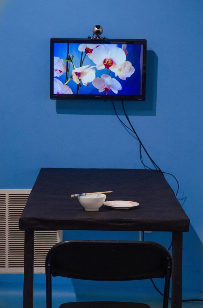 Awaiting Orchid is a metaphor for the digital relationship between the artist and his mother– Lan Huong (Orchid Scent). An orchid is streamed over the monitor as it wilts over the course of a month. Visitors are invited to sit at the dinner table and eat dried fish and rice as they watch a moment in the orchids’ life