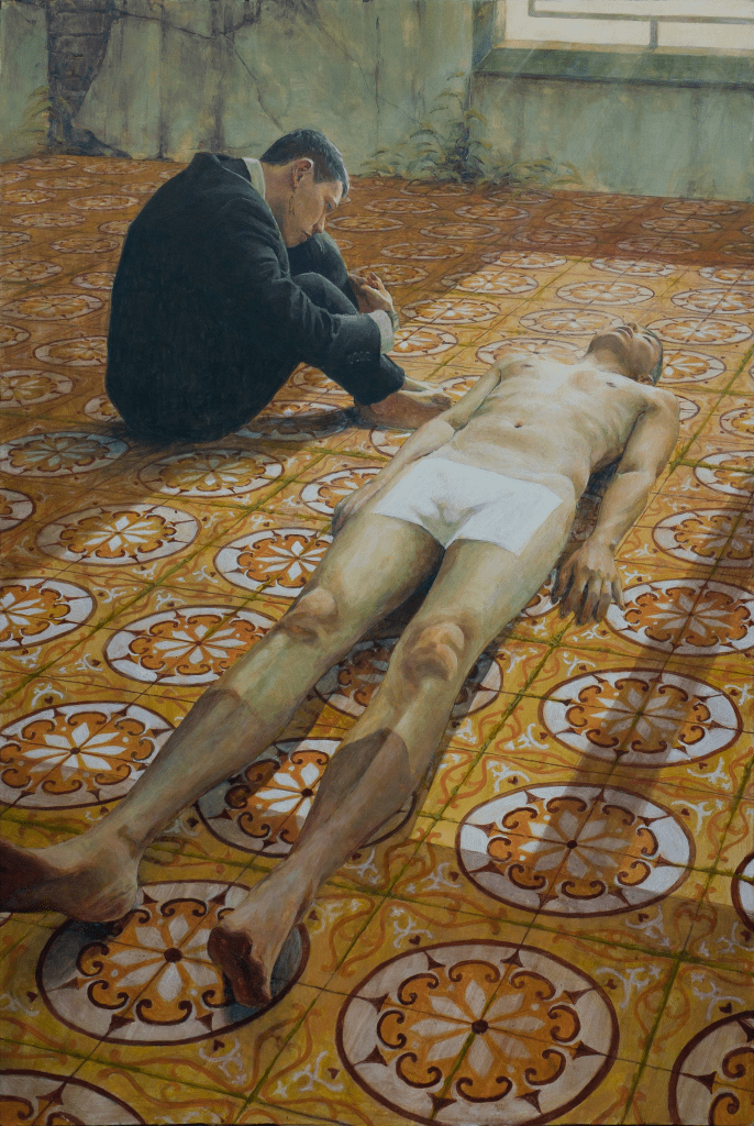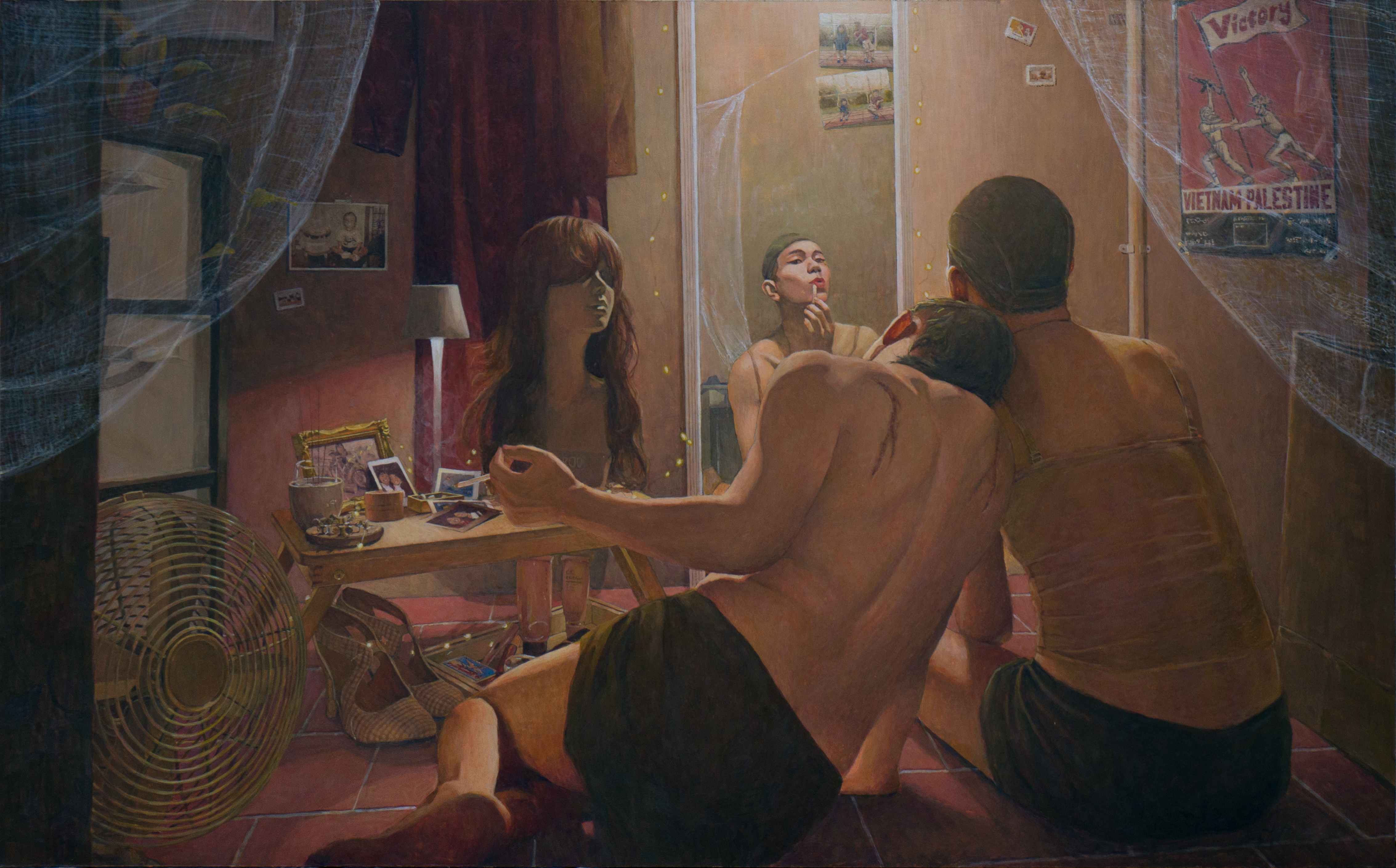 The other half is just about queer love and intimacy in general. The tiled floor and yellow wall is inspired by the Viet temples while the space itself is painted to resemble the home I grew up in. A few of the childhood photos were lent to me by queer friends. My partner lent me make up, props, and helped with reference.